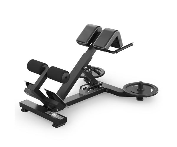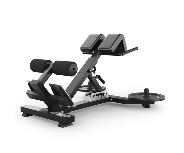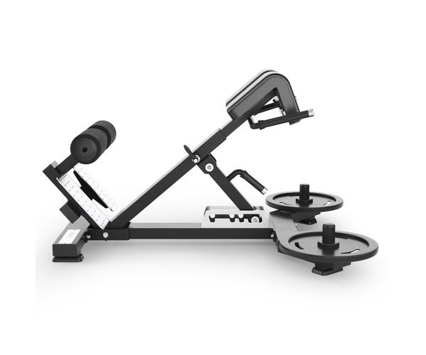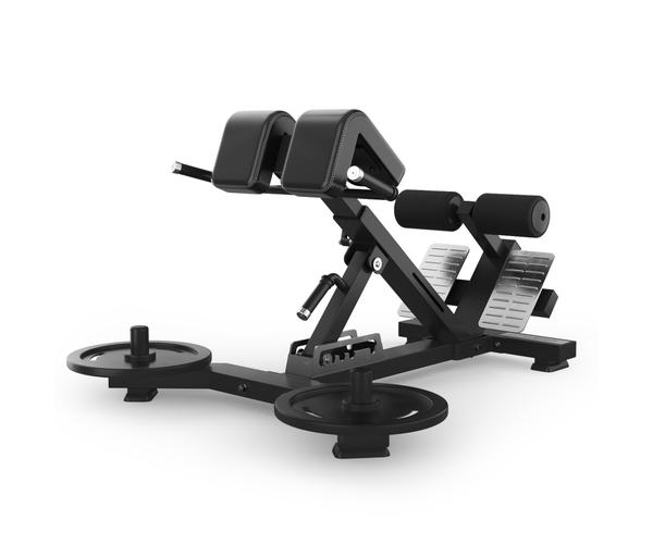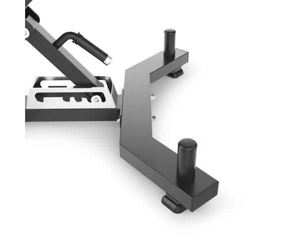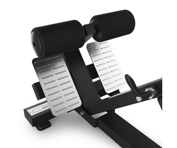 Тренажер для спины оснащена дополнительными адаптерами на которые можно добавлять нагрузку в виде дисков для повышения уровня сложности упражнений. Обрезиненная платформа для ног обеспечивает стабильность и комфорт на протяжении всего упражнения. Высота подушек для упора регулируется под любой рост. Упоры для ног выполнены из металла.