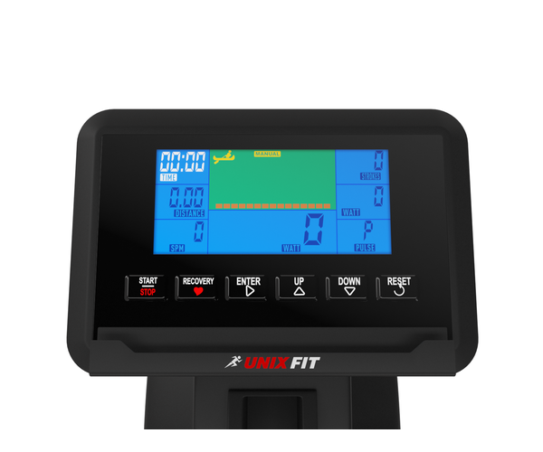 • Показания консоли 5.5” (14 см): время, калории, общее и текущее количество взмахов, SPM – показатель общего числа взмахов в минуту, нагрузка в Вт, расстояние, стоп, пульс, скан, время/500 м, HRC – показатель текущей частоты пульса к целевой.