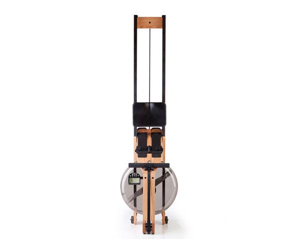 • Расположенный снизу резервуар с водой создает смещенный центр тяжести и это позволяет с легкостью поднять конец тренажера, поставить его вертикально или переместить при помощи колесиков. А при хранении в вертикальном положении WaterRower занимает площадь обычного стула.
