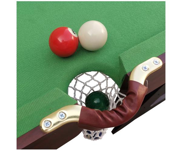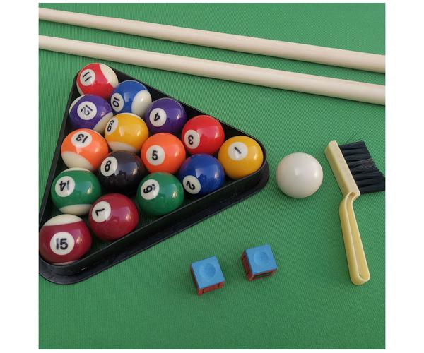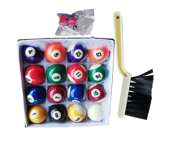 В комплекте все необходимые аксессуары: 2 кия, набор шаров для пула, треугольник, щетка, 2 мела.