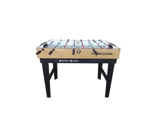 • Размеры и оформление игрового поля. Футбольное поле: 104 х 58 см, толщина 3 мм, с зелёной поверхностью и разметкой, установлены телескопические хромированные стержни 13 см в диаметре с футбольными игроками. Хоккейное поле: размер 93 х 47,5 см, толщина 4,75 см, покрытие бело-красное, с разметкой. Теннисный стол: классическое синее поле с разметкой для сетки 96 х 50 см, толщина 4,75 мм. Бильярдное поле: стол с мягким зелёным покрытием размером 97 х 51 см, толщиной 4,75 мм.