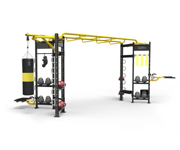 Комплекс из 2х модулей в форме буквы "I", состоит из: зоны растяжки и зоны бокса (без боксерского мешка), соединенных между собой посредством «рукохода», включающий плио платформу, опору для отжиманий (брусья) и шарнирный крепеж для грифа.