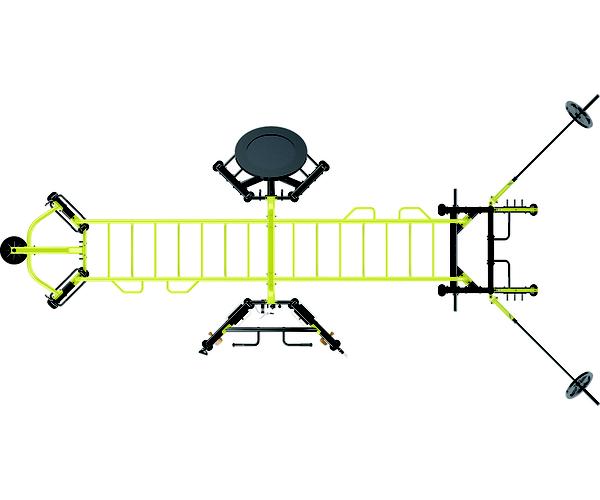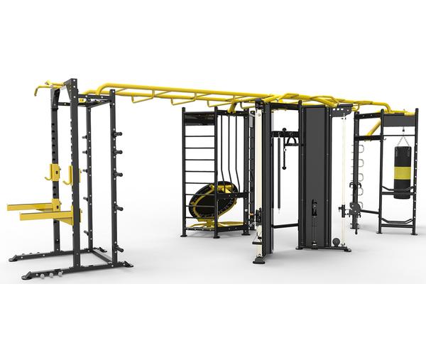 Комплекс из 4х модулей в форме буквы "X", состоит из: зоны бокса (без боксерского мешка), зоны реакции, зоны силовой нагрузки (силовой рамы) и двойной регулируемой тяги, соединенных между собой посредством 2-х «рукоходов» и специальной перекладины, включающий плио платформу, опору для отжиманий (брусья) и шарнирный крепеж для грифа.