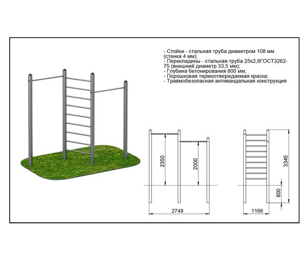 • Перекладина турника из стальной трубы диаметром 25х2,8 ГОСТ3262-75(внешний диаметр 33,5 мм), крепится к стойкам в антивандальный стакан с защитой от выкручивания