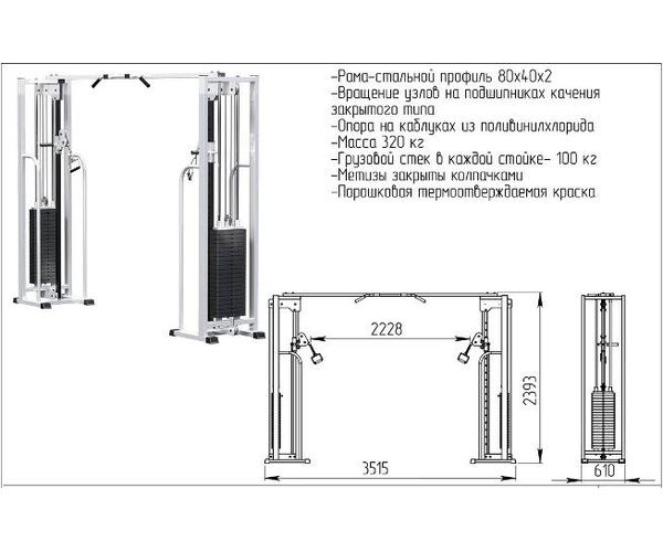 Тренажер Кроссовер на базе блочной рамы предназначен для развития мышц торса, мышц рук (дельты, трицепсы, бицепсы), а также мышцы ног (ягодичные, задний, внешние и внутренние мышцы бедра) с применение различных блочных ручек. Нагрузка при выполнении упражнений создается с помощью грузоблоков. Грузоблочный стек состоит из грузов по 5кг  и верхним грузом с направляющей. Устойчивая  конструкция тренажера Кроссовер дает возможность проводить занятия со спортсменами любого уровня. Для устранения скольжения и увеличения устойчивости тренажер имеет резиновые подпятники.