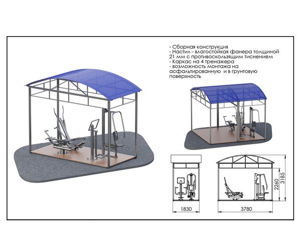 • Модульная конструкция на 4 тренажера. Профили в конструкции следующие: рамка под тренажеры: 40х60х2, 40х40х2; стойки навеса 60х60; крыша: 40х40х2, 40х20х2