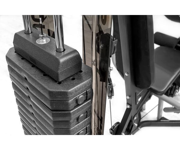 Мультистанция HastPower 300 полностью удовлетворяет даже самого изысканного фитнесс гурмана. Сегодня на рынке представлен большой выбор домашних мультистанций, но мало кто из производителей может предложить большой весовой стек (100 кг) и реальную компактность. Уникальная Y- образная конструкция рамы обеспечивает максимальную устойчивость, нет необходимости дополнительного крепления к полу при работе с большими весами. Эта конструкция позволяет значимо сэкономить пространство, делая тренажер одним из самых компактных на рынке. Весовой состоит из 20 плашек по 5 кг, имеющих виниловое покрытие, которое обеспечивает бесшумную работу. Ролики с подшипниками обеспечивают чрезвычайно плавное движение без рывков. Полупрозрачный кожух кожух гарантирует защиту. Толстая обивка спинки сидения создает дополнительный комфорт. Парта Скотта имеет регулировку по высоте (2 позиции). Баттерфляй, верхняя/нижняя тяга, жим от груди и бицепс — все эти упражнения Вы можете выполнять буквально не вставая с сиденья, т.к. конструкция мультистанции спроектирована максимально удобно для пользователя.