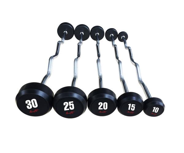 Набор профессиональных изогнутых обрезиненных штанг AeroFit подходят для интенсивной эксплуатации в фитнес-клубах с большой пропускной способностью.