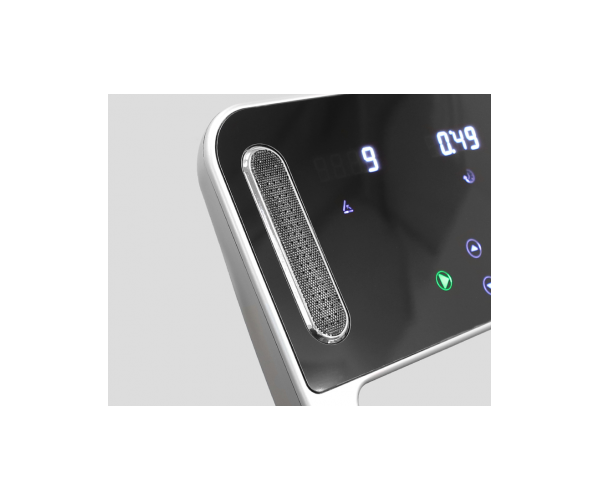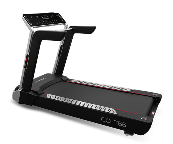 Особое внимание на GO T66 уделено консоли. В отличие от большинства других беговых дорожек, здесь используется небольшая тонкая прямоугольная консоль, покрытая черным глянцем. Тренировочный компьютер представлен профессиональным LED дисплеем и 4 дополнительными буквенно-цифровыми LCD экранами. Абсолютно все клавиши управления сенсорные и подсвечены внутренними светодиодами. Когда дорожка выключена, ее консоль представляет собой стильный черный экран. Встроенные программы ориентированы на любые возможные задачи. Помимо этого, есть 3 пульсозависимые и 3 пользовательские программы. Для точного определения пульса и просто комфортной тренировки в компьютер встроен высокоточный беспроводной телеметрический приемник (для считывания частоты сердечного ритма рекомендован нагрудный ремень-передатчик Polar T34). GO T66 синхронизируется с мобильным приложением FitShow™. Большой выбор уникальных программ, анализ статистических данных, функция регулировки скорости и угла наклона на мобильном телефоне помогут пользователям повысить эффективность занятий спортом.