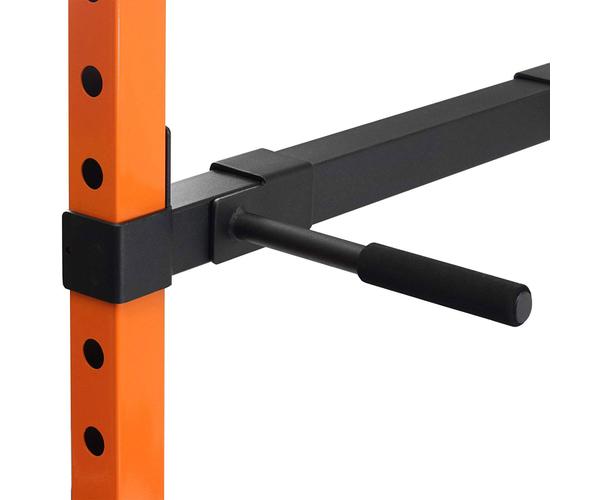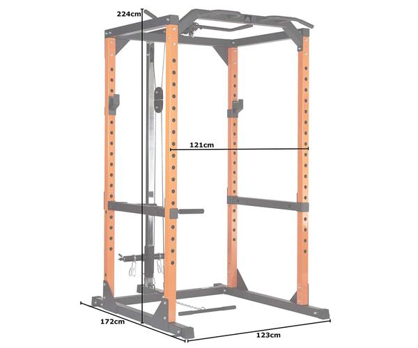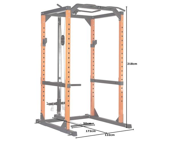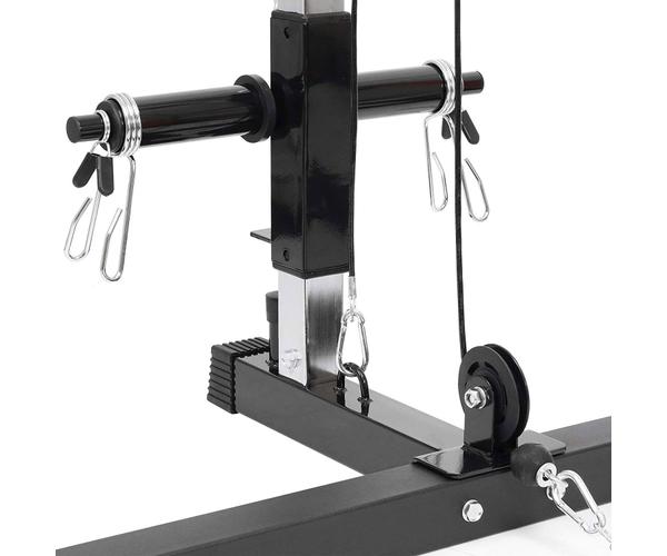 Тренажер со свободными весами. Позволяет выполнять следующие упражнения со штангой: приседания, жим, подтягивания на турнике, различные виды тяги и другие силовые тренировки. В качестве нагрузки для верхней и нижней тяги используются диски Ø25 мм (1") и Ø50 мм (2") через переходник общим весом до 100 кг. Диски размещаются на 2 держателя по 19 см каждый. Фиксация с помощью замков - пружина в комплекте. Пара держателей под штангу легко устанавливается на разной высоте. 18 уровней с шагом 8 см. Страховочные брусья так же быстро снимаются и переставляются на любую удобную высоту.