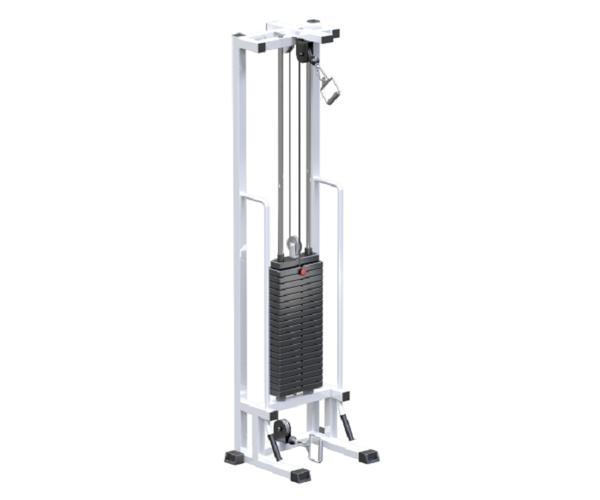 • Грузоблочный стек тренажера состоит из металлических обрезиненных плит весом по 5 кг, и хромированных направляющих. Изменение нагрузки происходит при помощи металлической иглы(фиксатора). Для приведения в движение грузов используется трос 5 мм в пвх оплетке с усилием на разрыв 500 кг с максимальной нагрузкой – 800 кг