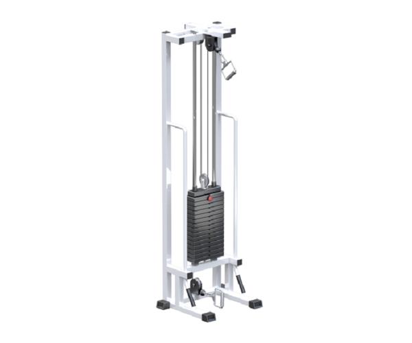 • Грузоблочный стек тренажера состоит из металлических обрезиненных плит весом по 5 кг, и хромированных направляющих. Изменение нагрузки происходит при помощи металлической иглы(фиксатора). Для приведения в движение грузов используется трос 5 мм в пвх оплетке с усилием на разрыв 500 кг с максимальной нагрузкой – 800 кг