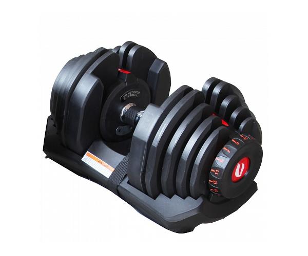 Уникальный замковый механизм сам цепляет, либо открепляет нужные блины от грифа для набора определенной массы. Благодаря тонкой настройке можно абсолютно четко отрегулировать вес гантели во время тренировки.