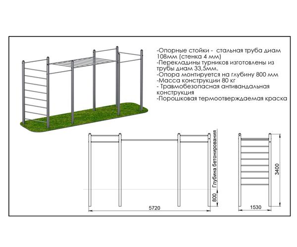• Перекладины турников изготовлены из трубы диаметром 33,5 мм, стягиваются при помощи винтов
