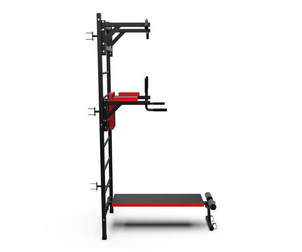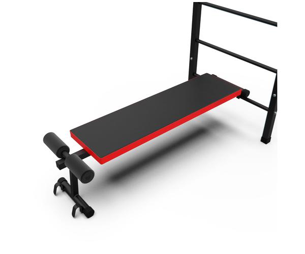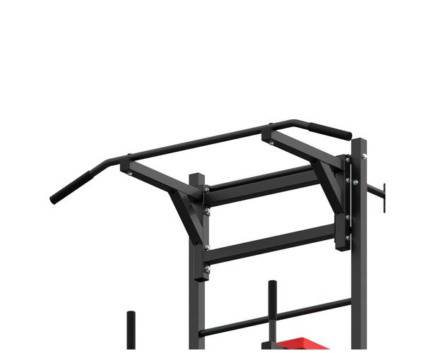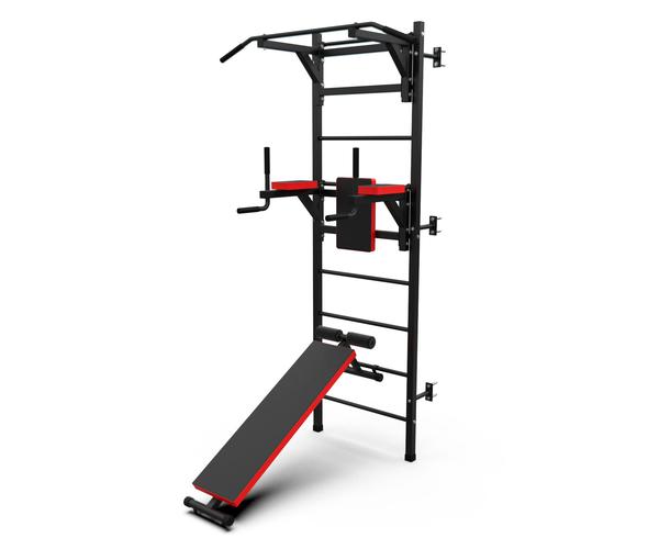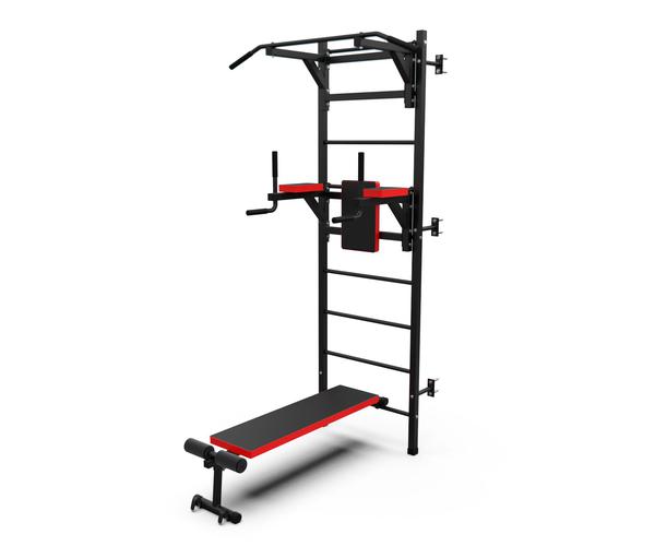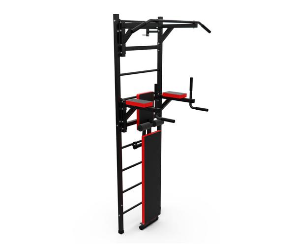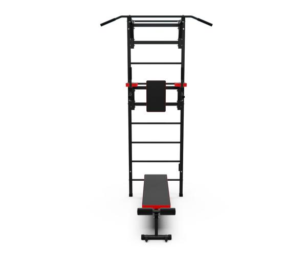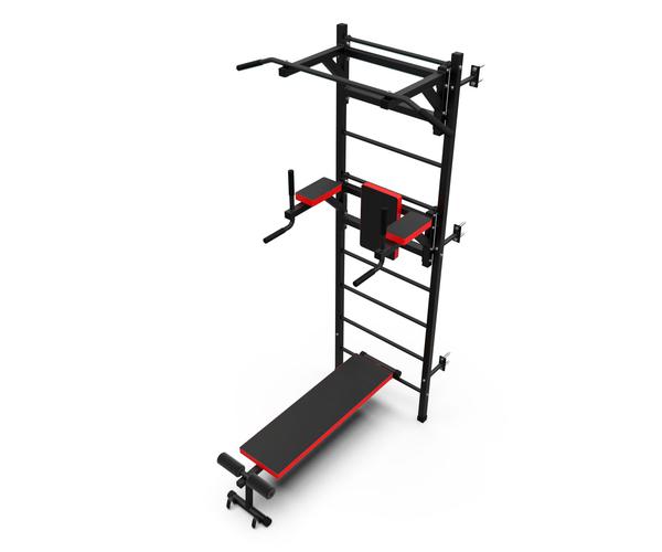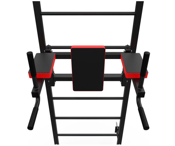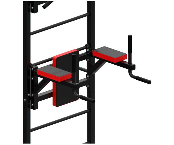 Турник длиной 99 см оснащён мягкими неопреновыми ручками, очень легко перевешивается на перекладины шведской стенки, что позволяет менять его высоту. Расстояние от ручек турника до шведской стенки (вынос турника) - 72 см. Вынос брусьев – 87 см, размер подушки под спину 42 х 25 см, а её толщина 5 см. Подушки подлокотников размерами 25 х 13 х 5 см, а поручни длиной 32 см диаметром 25 мм и толщиной стали 1,5 мм.