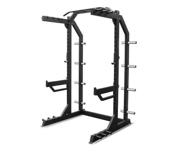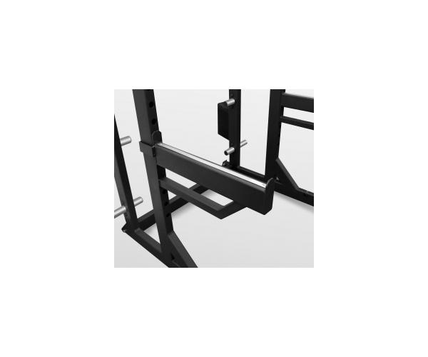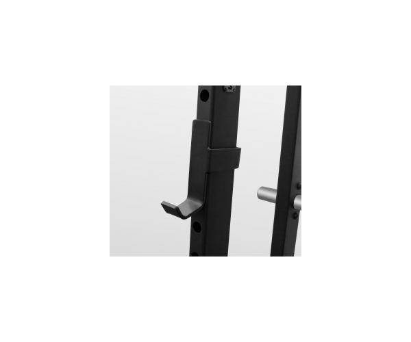 Конструкция рамы включает в себя страховочные ограничители и съемные крюки для грифа.