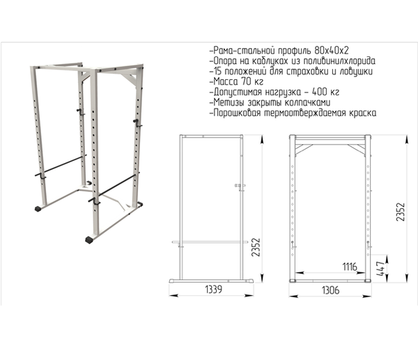 Сталь выдерживает нагрузку до 400 килограмм. Размеры рамы дают достаточно пространства для маневра и позволяют пользователям любой комплекции тренироваться с максимальной нагрузкой и комфортом. Регулируемые держатели для штанги позволяют разнообразить тренировку.