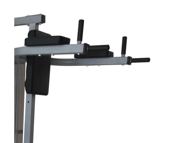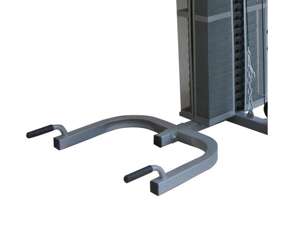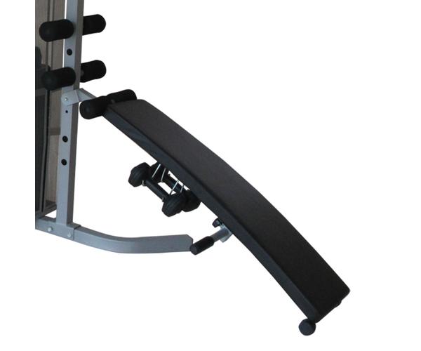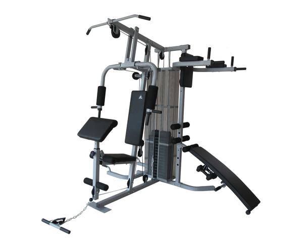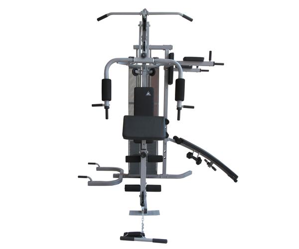 Многофункциональный тренажер DFC D7005A с встроенным весовым стеком. Позволяет выполнять комплекс упражнений на различные группы мышц. Дополнительно тренажер имеет брусья для отжимания и скамью для пресса с гантелями по 1,5 кг с регулировкой по углу наклона.