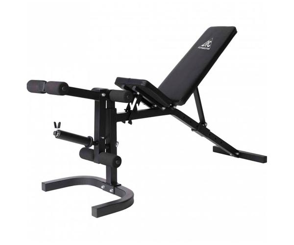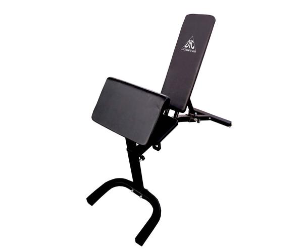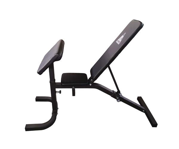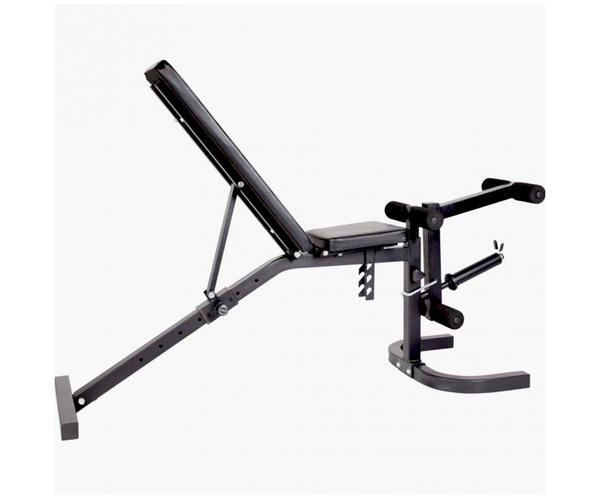В комплекте идет универсальная силовая скамья с дополнительными опциями: партой для бицепса и жим ногами. Сиденье и спинка скамьи регулируются по углу наклона. Сиденье 3 положения, спинка 7. Скамья, валики для ног и парта имеют износостойкую обивку из кожзама. В качестве нагрузки на жим ногами используются диски с посадочным Ø51 мм. Нагрузка на скамью до 400 кг.