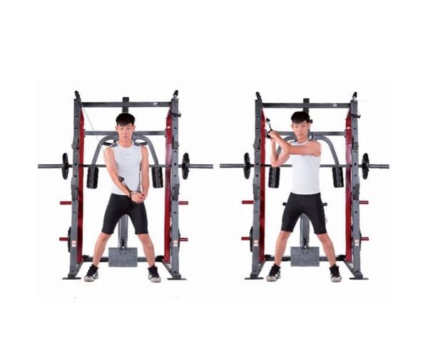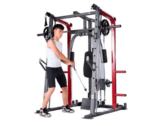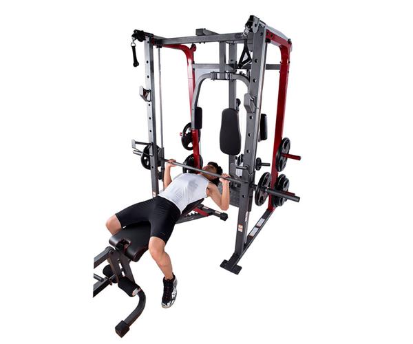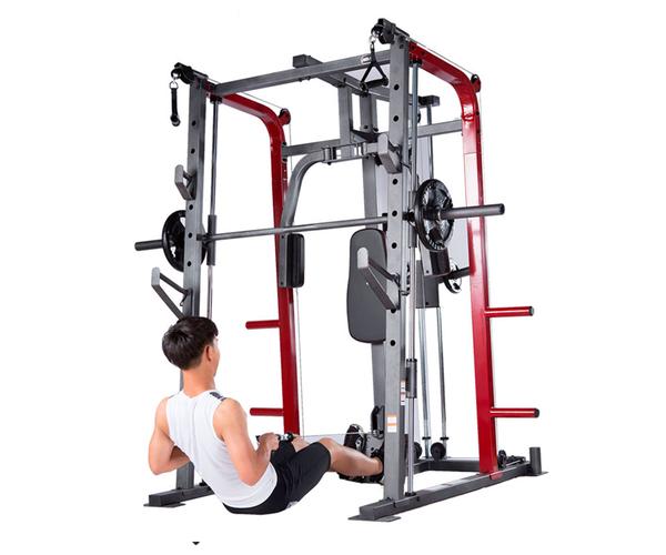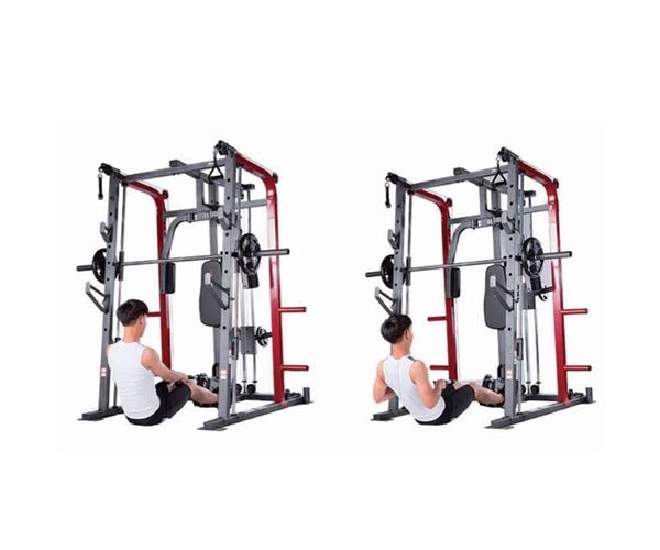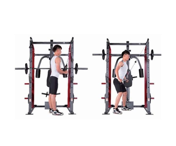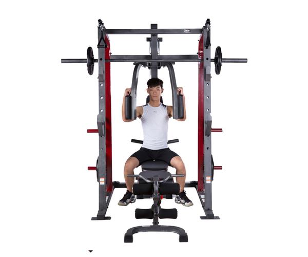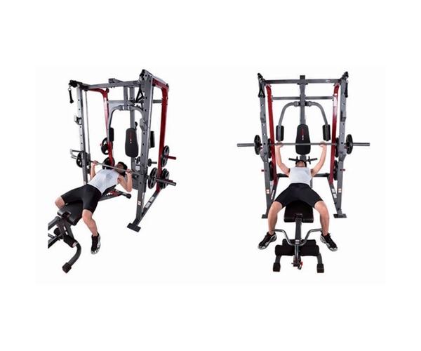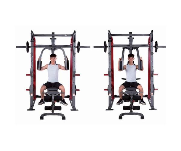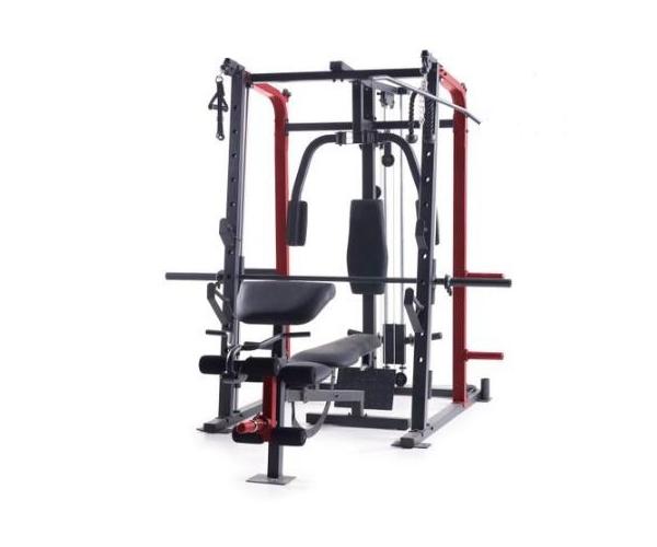 Тренажер предназначен для выполнения различных силовых упражнений: Машина Смита, тяга сверху / снизу, баттерфляй, парта для бицепса, сгибание / разгибание, жим лежа на скамье дополнительной штанги (штанга и диски опция).