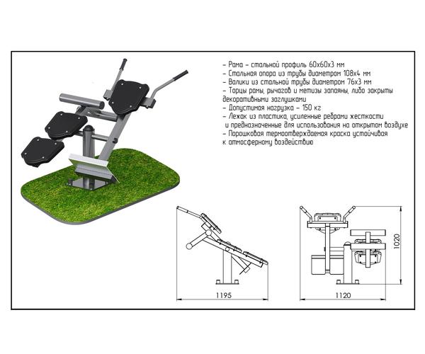 Пользователь встает на опору для ног, фиксирует ноги, передней частью бедер упирается на упор.