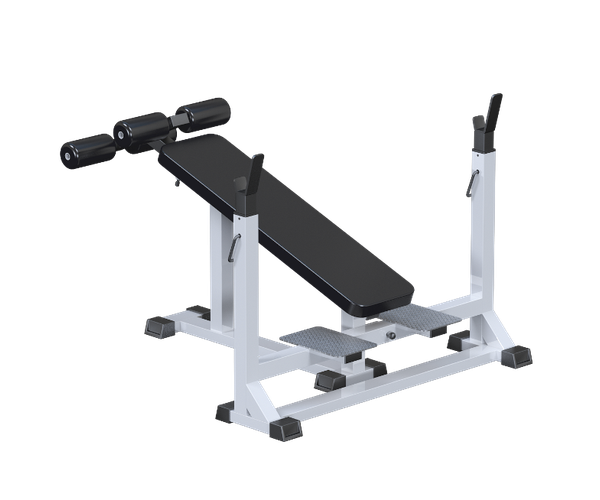 Скамья для штанги со стойками с обратным наклоном развивает нижнюю часть больших грудных мышц благодаря выполнению упражнения «жим лежа головой вниз». Тренажер оснащен крюками разной высоты и регулируемыми валиками по росту спортсмена для надежной фиксации тела и ног во время занятий. Для устранения скольжения и увеличения устойчивости тренажер оснащен резиновыми подпятниками. Скамья для штанги со стойками с обратным уклоном – один из важных тренажеров для любого атлета