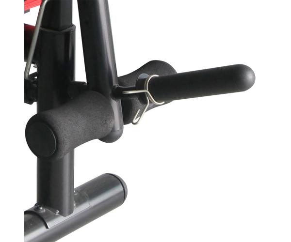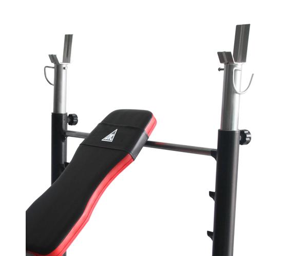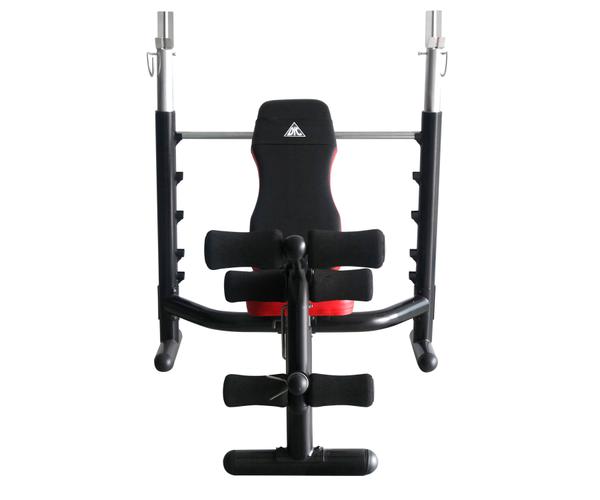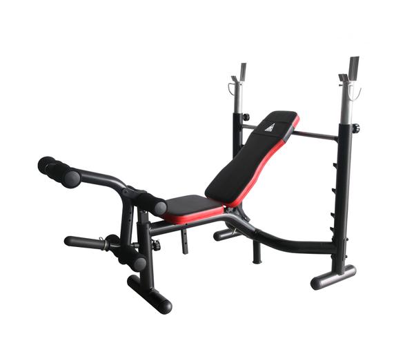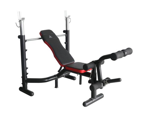 Скамья под штангу DFC D31 -скамья силовая со стойками под штангу. Дополнительно установлена опция жим ногами. Прочная устойчивая конструкция с ударопрочным эмалевым покрытием. Позволяет выполнять упражнения: жим лежа, сгибание и разгибание ног в коленном суставе. Рычаги блока для ног снабжены мягкими валиками. Стойки тренажера регулируются по высоте. В качестве нагрузки используются диски диаметром 50 мм (через переходник в комплекте).