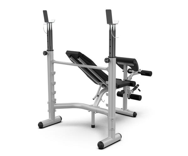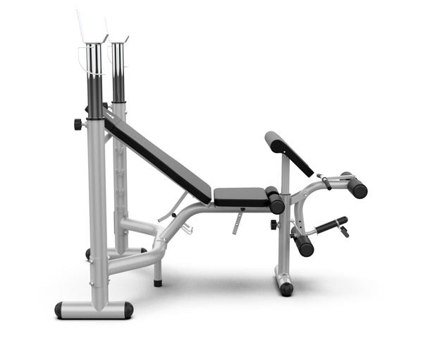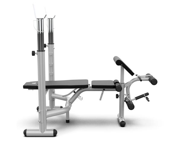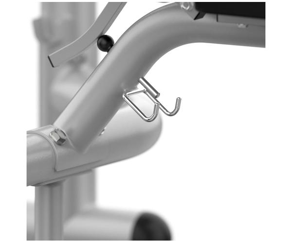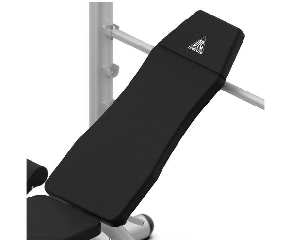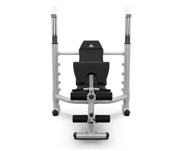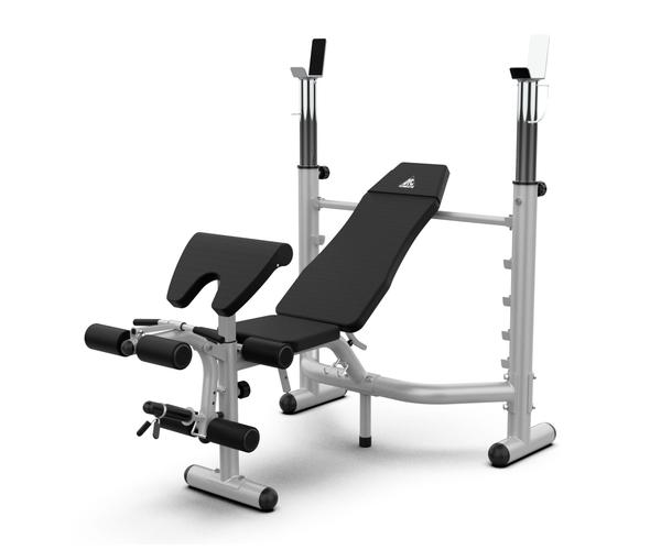 Стойки выполнены из хромированной стали, спинка и сиденье регулируются по углу наклона с большей амплитудой, а под сиденьем предусмотрен держатель для гантелей. В качестве утяжелителя используются диски диаметром 26 мм и 51 мм (приобретаются отдельно).