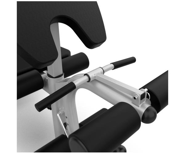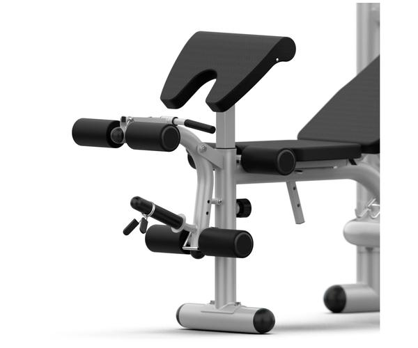 Съёмная ручка длиной 29,5 см и шириной 43 см с нескользящими накладками используется для упражнений на бицепс. Валики длиной 41 см используются для прокачки ног. Внешний диаметр валиков - 7,5 см, внутренний - 2,2 см . Втулка утяжелителя длиной 20 см с нескользящим покрытием позволит использовать диски диаметром 26 мм.