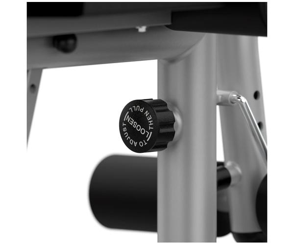 Спинка скамьи размером 75 х 24-30 х 4,5 см регулируется на 5 уровней по углу наклона: 13,6°, 28,3°, 40°, 65°, 180°. Сиденье регулируется на 3 уровня: 0°, 18,5°, 35,5°.Расстояние от сиденья до пола составляет от 50,5 до 71,5 см, в зависимости от угла наклона. Максимально допустимая нагрузка на скамью составляет 170 кг. Под сиденьем расположен металлический держатель для гантели, выдерживающий до 15 кг.