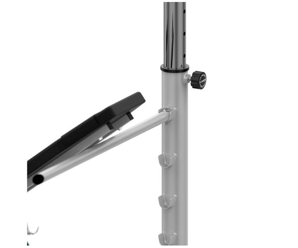 Максимальная нагрузка на хромированные стойки допустима до 110 кг. Благодаря хромированному покрытию, они прослужат дольше и будут меньше подвергнуты коррозии. Стойки под штангу с металлическими замками регулируются по высоте на 5 уровней от 117,3 до 138 см с шагом 7 см.