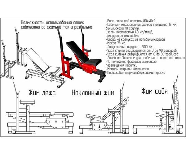 Линейное перемещение скамейки по раме позволяет быстро перестроить ее под выполнение другого упражениния. Узлы фиксации позволяют использовать скамью со стойками, а так же обеспечивают быструю переналадку для использования тренажера без стоек. Регулировка спинки и седения позволяет заниматься на тренажере людям с разными ростовыми характеристиками. Тренажер оснащен амортизирующими подпятниками, не требующими крепления к полу.