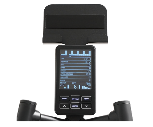 Информативный ЖК Дисплей. Информативный ЖК-дисплей предоставляет информацию о параметрах тренировки. Отображаемые параметры: Скорость, Дистанция, Время, Расчет потраченных калорий, Информацию о пульсе (ЧСС), Нагрузка в Вт.