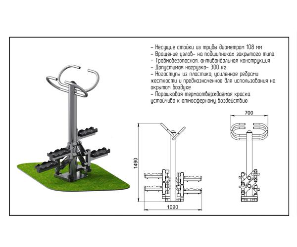 • Тренажер крепится на закладной элемент, который монтируется на глубину 500 мм и представляет собой платформу из листа с армирующей обвязкой. Размеры закладного элемента 300х300 мм с межцентровым расстоянием шпилек 240 мм, высота шпильки 30 мм над уровнем закладного, диаметр шпильки 16 мм. Гайки утапливаются в антивандальное гнездо тренажера, оснащенное заглушкой от выкручивания