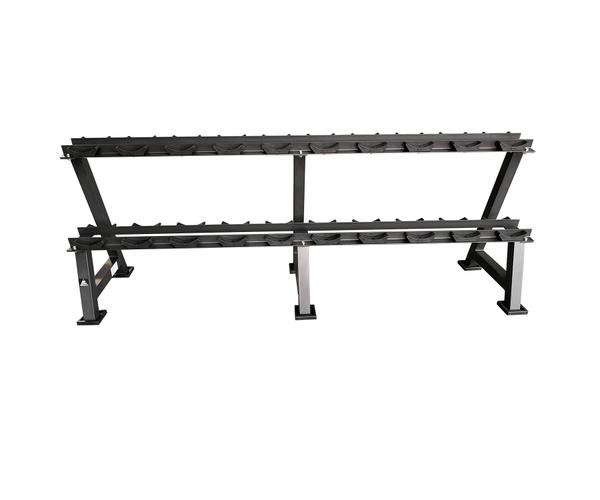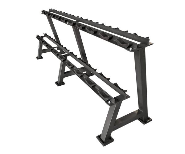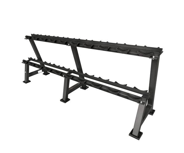 Стойка для хранения 10 пар профессиональных гантелей. Изготовлена из высококачественного стального профиля размером 60х60 мм и толщиной 2 мм. Выдерживает нагрузку до 500 кг. Полумесяцы для укладки гантелей изготовлены из полипропилена.