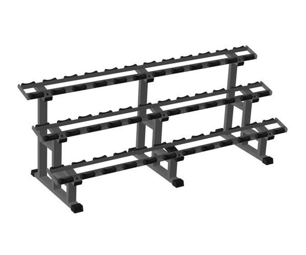 Стойка для профессиональных гантелей трехъярусная на 18 пар горизонтальная предназначена для хранения профессиональных гантелей «Айрон Кинг», но при этом возможно укладывать на стойку гантели большинства других изготовителей.