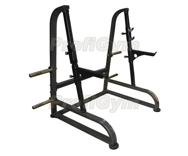 Стойка имеет широкие регулируемые страховочные площадки, что не ограничивает амплитуду движений, и при этом делает упражнение безопасным. Также по высоте регулируются подставки под штангу. Конструкция жесткая и прочная, рассчитана на большие нагрузки в атлетическом зале.