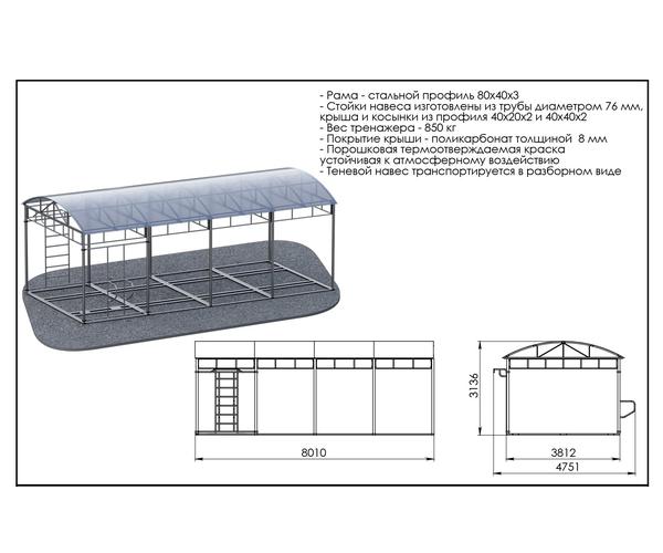 • Стойки навеса изготовлены из трубы диаметром 76мм, крыша и косынки из профиля 40х20х2 и 40х40х2 мм. Рельсы под тренажеры из профиля 80х40х3