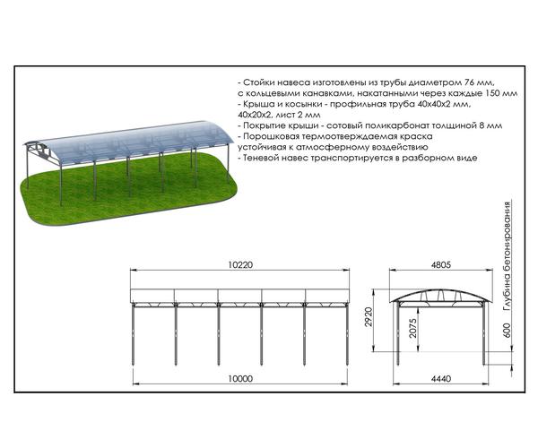 • Стойки навеса изготовлены из трубы диаметром 76 мм с кольцевыми канавками, накатанными через каждые 150 мм