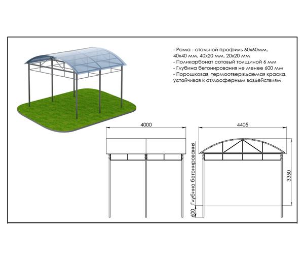 • Стойки навеса изготовлены из профильной трубы 60х60 мм, крыша(ферма) и косынки из профиля 40х20х2, 20х20х2 и 40х40х2 мм