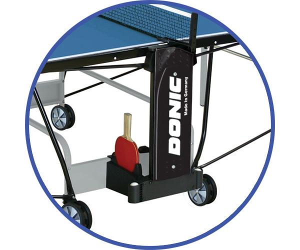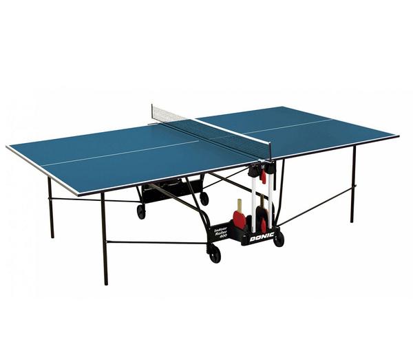 Donic Indoor Roller 400 - качественный теннисный стол производства Германии, предназначеный для использования в помещении. Подходит в качестве тренировочного стола для учебных заведений и клубов. Удобная компактная система сложения, легко складывается и раскладывается, оборудован надежной системой блокировки столешниц. Рама изготовлена из стальных труб диаметром 25 мм, покрытых порошковым покрытием. Стол имеет 4 колеса диаметр 125 мм,  одна сторона маневровая. Так же стол оборудован встроенной сеткой, не требующей демонтажа при складывании. Предусмотрена возможность одиночной игры. Имеется держатель ракеток и мячей.
