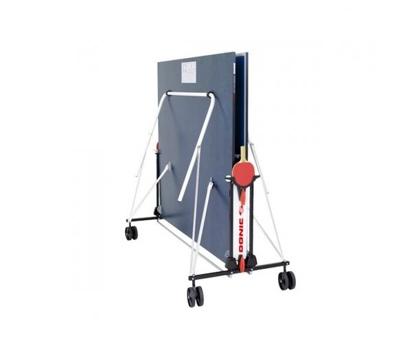 Стол имеет 4 колеса диаметр 125 мм, одна сторона маневровая. Так же стол оборудован встроенной сеткой, не требующей демонтажа при складывании. Предусмотрена возможность одиночной игры. Удобный держатель ракеток и мячей.