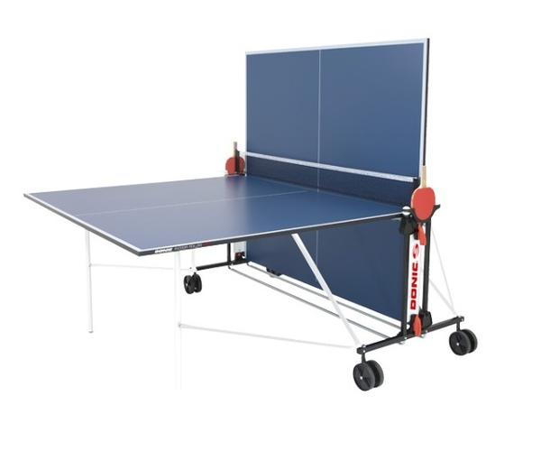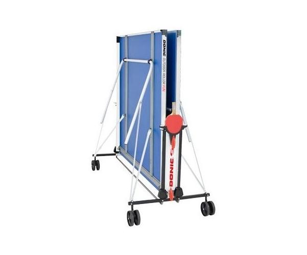 Стол оборудован надежной системой блокировки столешниц. Колёса диаметром 125 мм придают столу стабильность и манёвренность в сложенном состоянии. Сетка и держатель для ракеток входят в комплект, в сложенном состоянии их демонтаж не требуется. Возможность тренироваться без партнёра, при вертикальном положении одной половины стола. Рекомендуется для домашнего использования на открытом воздухе, домов отдыха и пансионатов.