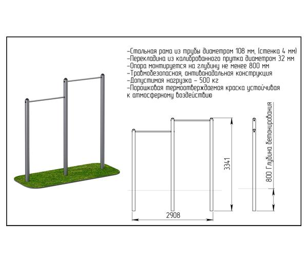 • Перекладина из калиброванного прутка диаметром 32 мм, крепится к стойкам в антивандальный стакан с защитой от выкручивания