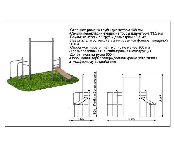 • Секция перекладин - турник из трубы диаметром 33,5мм, толщина стенки 3 мм