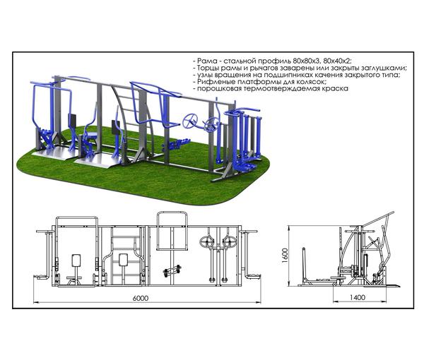 • В состав комплекса входят уличные тренажеры: разведение ног, лыжник, степпер, шведская стенка (для инвалидов), твистер, маятник, рули, брусья (для инвалидов), жим от груди (для инвалидов-колясочников), подтягивание (для инвалидов-колясочников)
