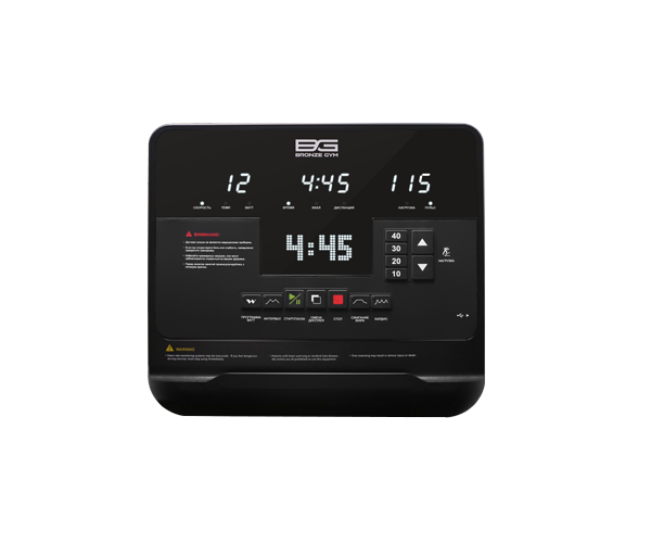 Тренировочный компьютер на Bronze Gym U1200M PRO представлен многофункциональным матричным LED-дисплеем диагональю 15,6 дюймов. Основной экран дополняют 3 небольших буквенно-цифровых LED-дисплея. На мониторах отображаются следующие данные: время, скорость, дистанция, уровень нагрузки, расход калорий, пульс, темп, Ватт. Все клавиши и дисплеи оснащены белой подсветкой, а надписи русифицированы. В число тренировочных режимов входит кардиотренировка, интервальная программа, Ватт-программа и программа сжигания жира. Помимо предустановленных программ, можно воспользоваться самостоятельно регулируемым ручным режимом.