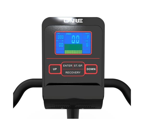 Дисплей велотренажера с синей подсветкой отображает множество параметров, включая профили пользовательских настроек, предустановленные программы тренировок, контроль мощности, контроль пульса, восстановление пульса, обороты в минуту, время, скорость, расстояние, количество сожженных калорий и ватты. На выбор пользователя представлена 21 программа тренировки, а также функция Bluetooth.