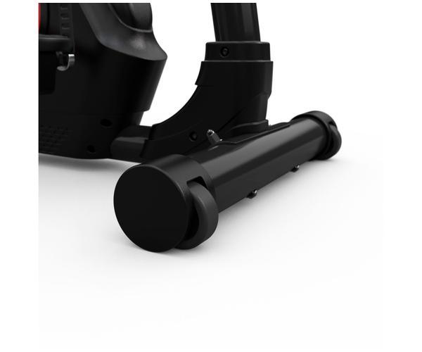Для удобства тренировки на поручнях установлены сенсорные датчики пульса, а на консоли есть подставка для планшета. В конструкции предусмотрены компенсаторы неровностей пола и транспортировочные ролики, которые облегчают перемещение тренажера.