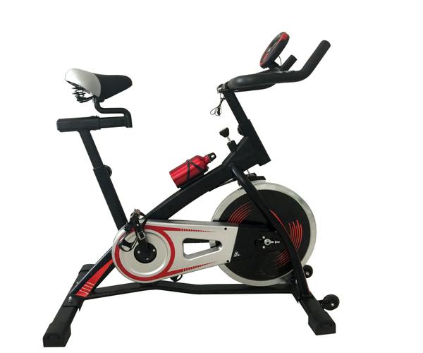 Вертикальный механический Спин-байк DFC B8301 с ременным типом привода и колодочной системой нагружения. Изменение нагрузки с помощью рукоятки на корпусе тренажера.